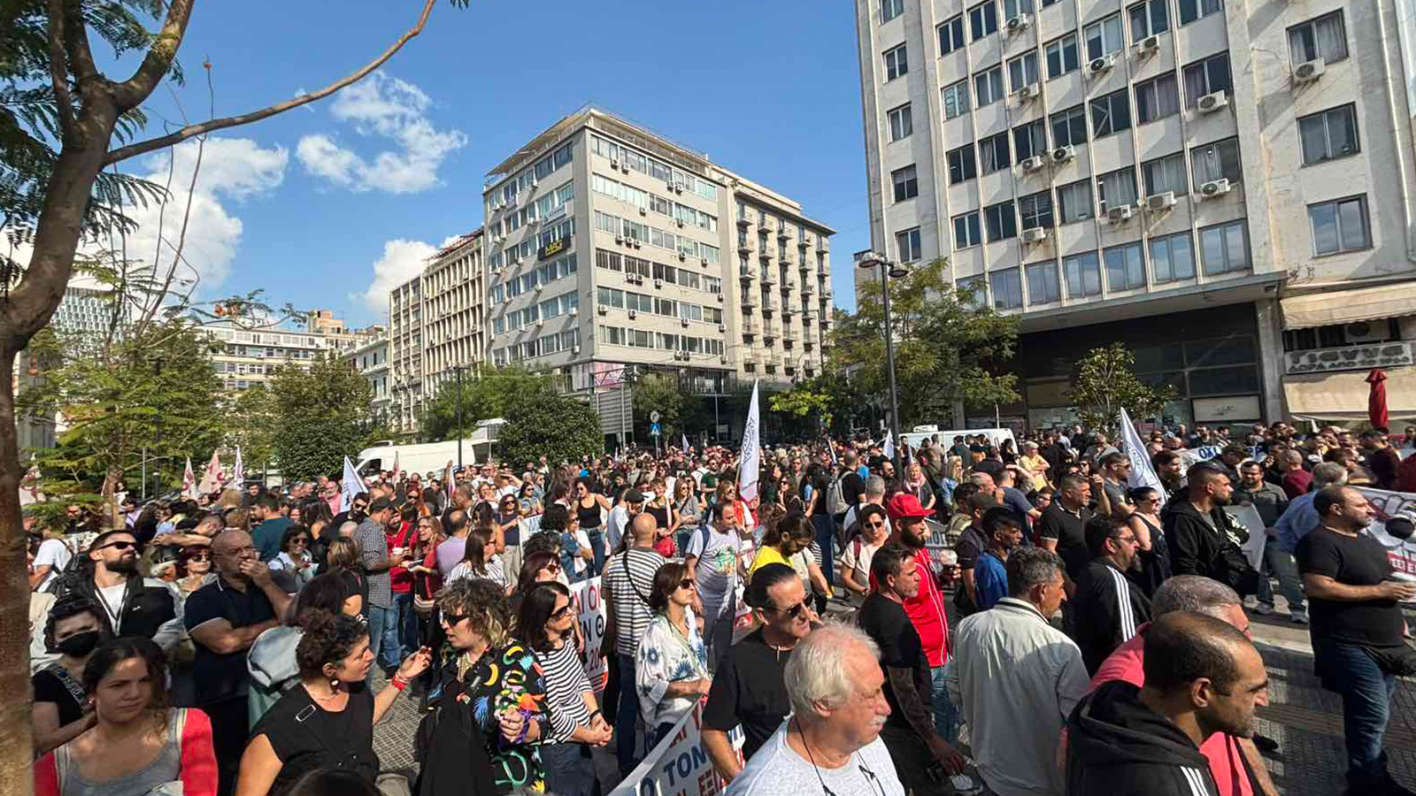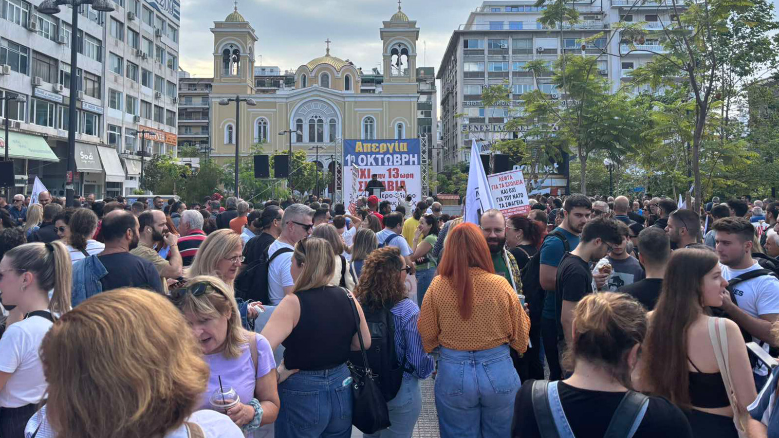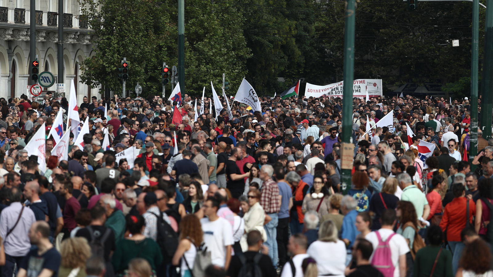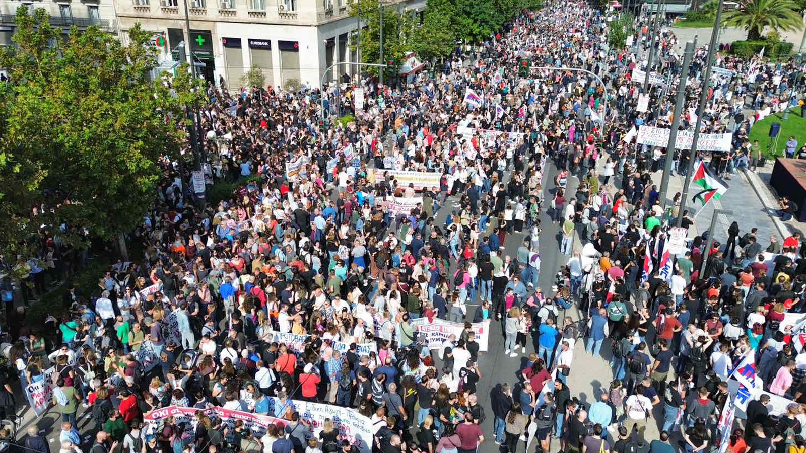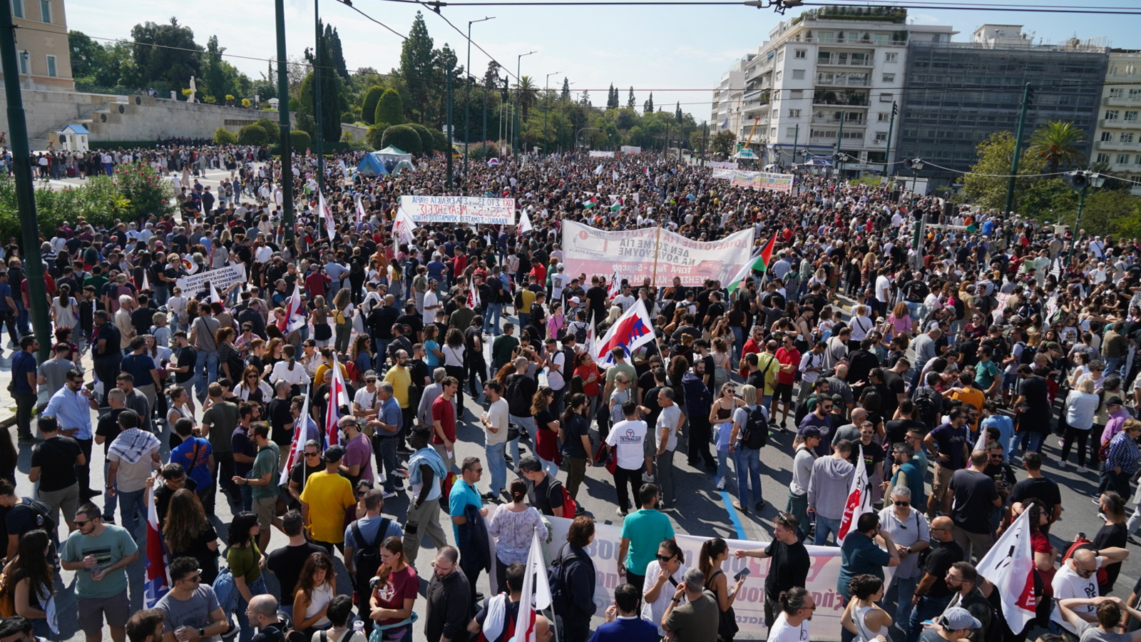 В изявлението си Общоработническият боеви фронт (ПAME) заявяви „Масовото участие на трудещите се в стачката и митингите свидетелства за натрупания гняв срещу антинародната политика като цяло, която превърна работните места в смъртниарени. Те са обезпокоени също и от поскъпването на живота, което поглъщасемейните доходи, но и за здравеопазването, което се превърна в скъпа стока, за образованието, където има сериозен недостиг на учители през новата учебна година, и непоносимите разходи за образование на нашите деца. Те са обезпокоени и от оскъдните пенсии, които са недостатъчни за достоен живот в напреднала възраст. Стачкуващите изразиха недоволството си от участието на страната ни в кървавите империалистически войни, както и от подкрепата на гръцкото правителство за касапина Нетаняху и държавата-убиец Израел, която извършва геноцид срещу палестинския народ. Те изразиха масово недоволството си от увеличаването на държавните военни разходи за нуждите на НАТО, както и от факта, че човешкият живот не се взема предвид, счита се за разходен, както показва железопътното престъпление в Темпи, трагедията с 57 убити, предимно млади хора”.
