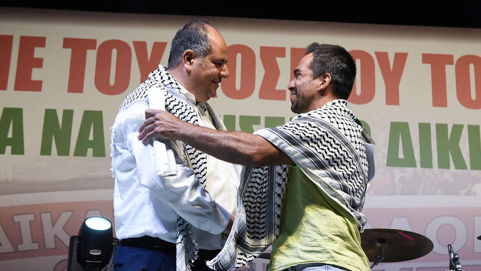 В театре «Петра», подсвеченном цветами палестинского флага, П. Александракис осудил зверства в отношении многострадального палестинского народа, совершаемые вот уже около двух лет государством-убийцей Израилем при полной поддержке США, НАТО и ЕС. «Мы с Палестиной! Свободу Палестине!» - скандировал он, приветствуя акции солидарности, проходящие по всему миру. На концерте присутствовала делегация ЦК КПГ, а также посол Палестины в Афинах.