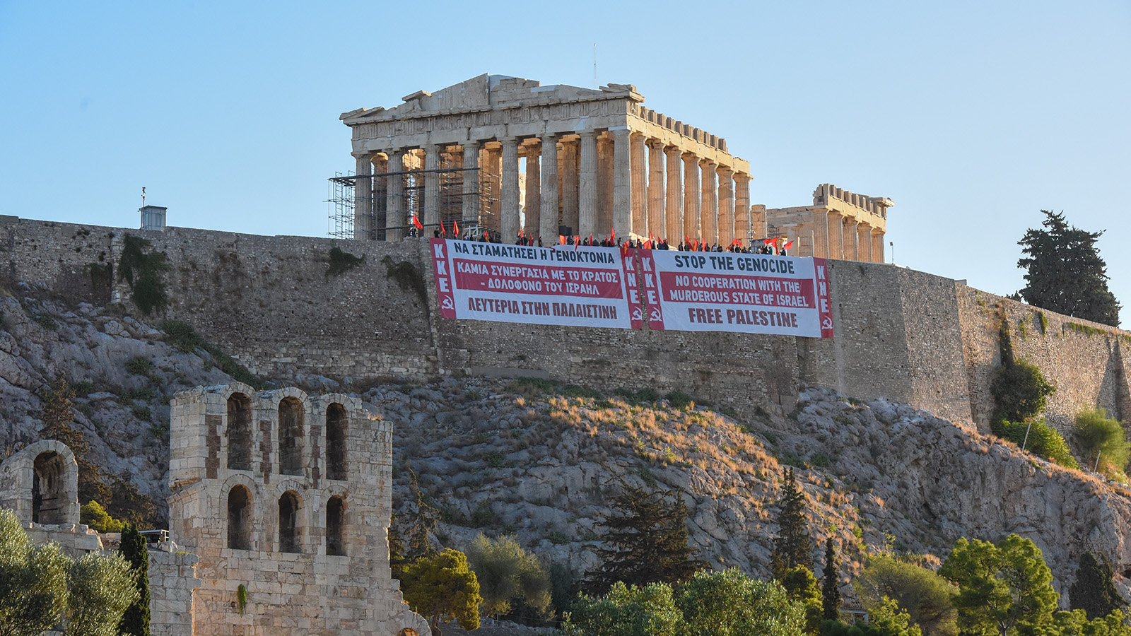 В ходе согласованных действий рано утром 19 сентября 2025 года членам КПГ и КМГ удалось подняться на скалу Акрополя и повесить два баннера с надписями на греческом и английском языках: «Остановить геноцид. Никакого сотрудничества с государством-убийцей Израилем. Свободу Палестине».