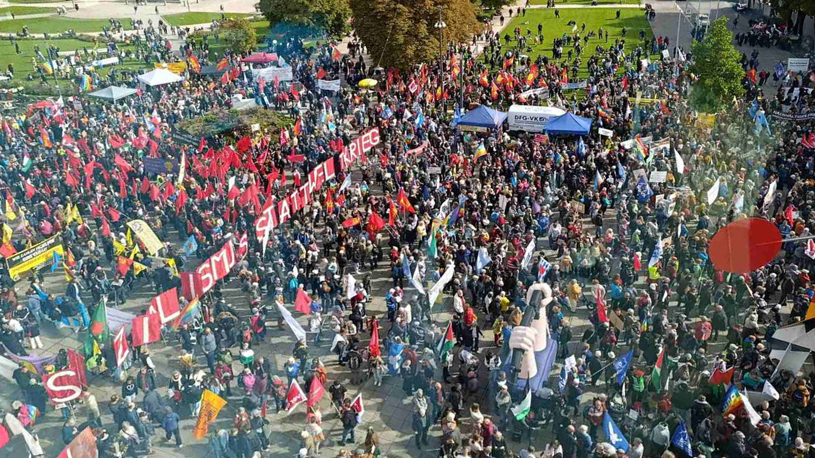 В пятницу, 3 октября, в Берлине и Штутгарте прошли две массовые антивоенные демонстрации. Десятки тысяч рабочих и молодёжи вышли на демонстрации по призыву профсоюзов, массовых организаций, комитетов мира и политических партий с лозунгами против перехода экономики на военные рельсы и подготовки к войне, а также против геноцида в Палестине, несмотря на то, что в большинстве призывов руководства социал-демократических профсоюзов ничего не говорилось о геноциде в связи с позицией СДПГ в поддержку государства Израиль.