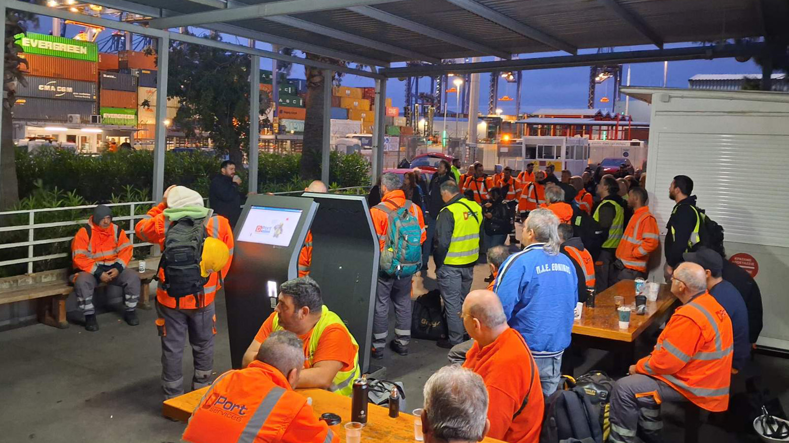Ata dhanë edhe një herë sinjalin, ashtu si dhe me mobilizimet e tjera të tyre në të kaluarën, me të cilat bllokuan ngarkesat e vdekjes, se «Ne nuk do të bëhemi ingranazhe në makinën e luftës! Portet nuk do të bëhen baza lufte!». Ata bashkuan zërat me kolegët e tyre në portet e tjera në Mesdhe dhe në të gjithë Europën, siç kishin vendosur në takimin e fundit ndërkombëtar të koordinimit të luftës së tyre. I pranishëm në tubimin e grevës të punëtorëve të portit ishte edhe Niko Abatielos, deputet i Partisë Komuniste të Greqisë (KKE).