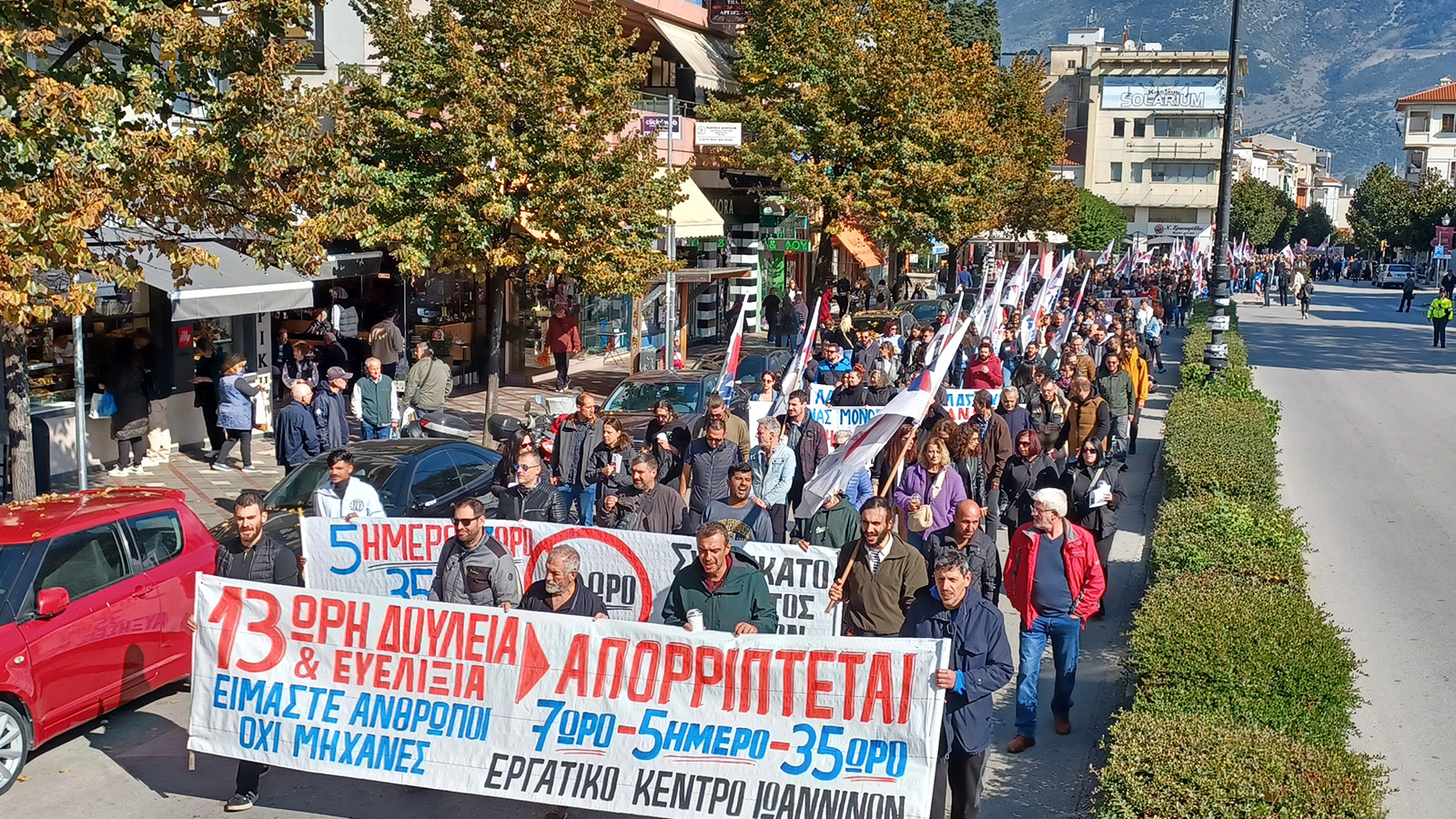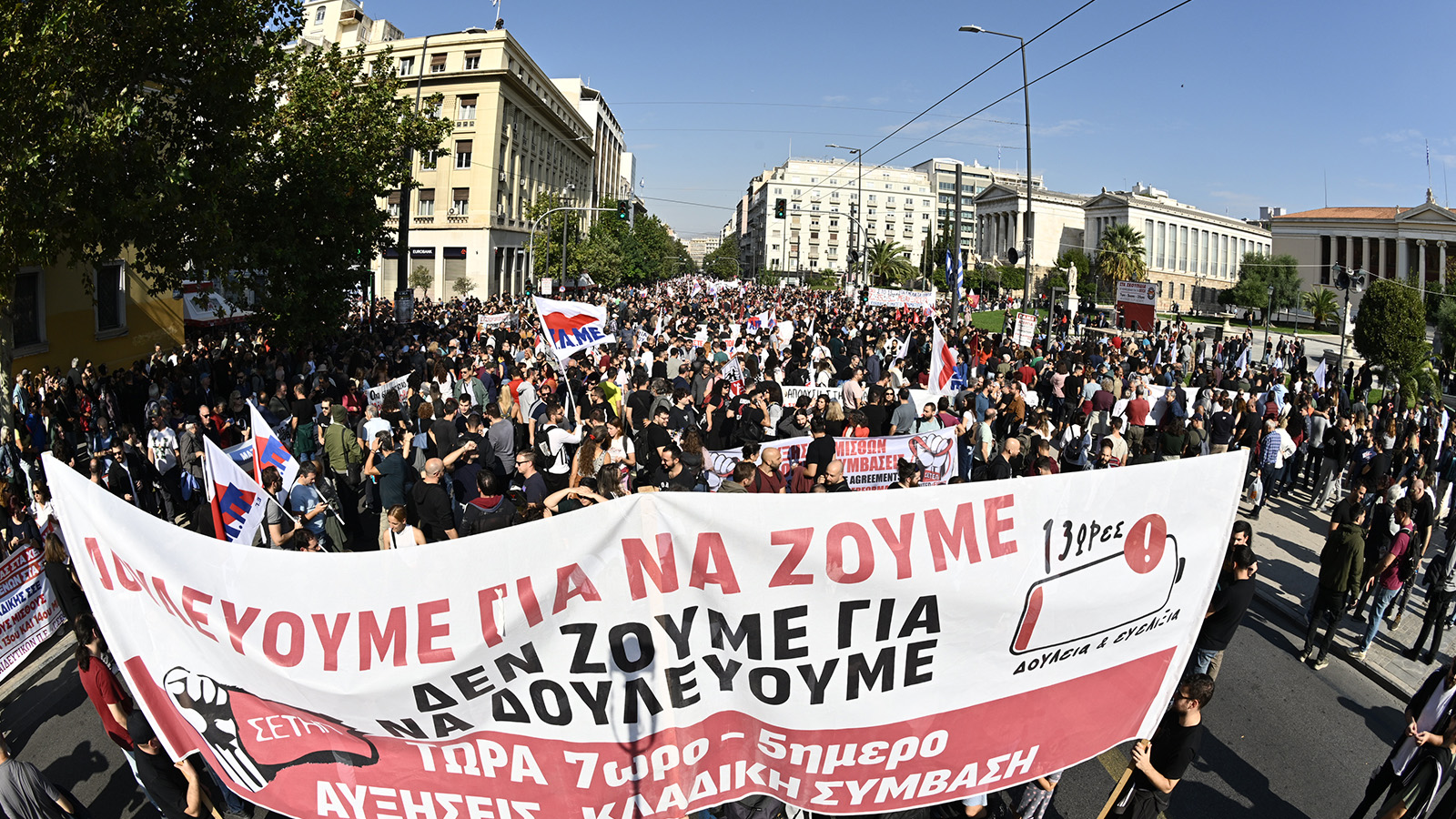 Yunanistan'da, 13 saatlik işgünü öngören işçi karşıtı yasa tasarısının parlamentoda görüşülüp oylandığı gün 14 Ekim 2025 tarihinde, tüm işçiler, 15 gün içinde ikinci kez 24 saatlik greve gitti.